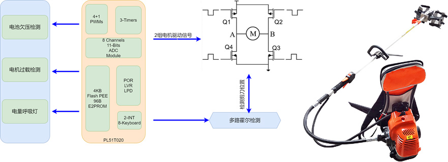 本方案采用PL51T020芯片,芯片内集成4KB-flash,128Byte真EEPROM,11Bit-ADC, 4路PWM等丰富资源。系统利用PL51T020偏上集成诸多资源,实现剪刀机开关信号,位置信号等检测,电机过载异常检测;电路简洁成本可控。